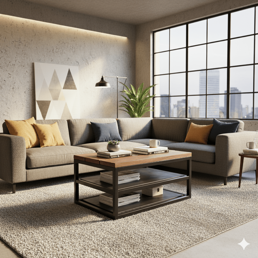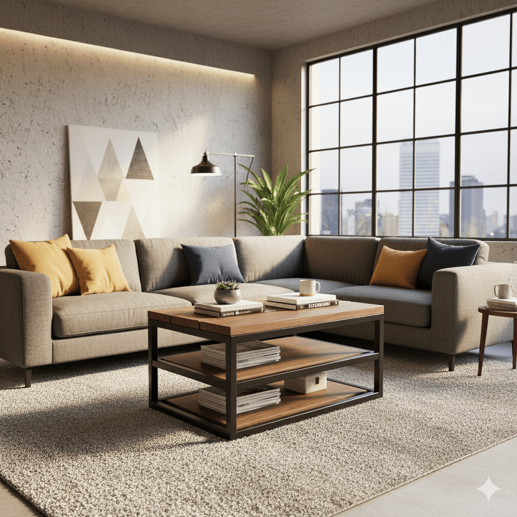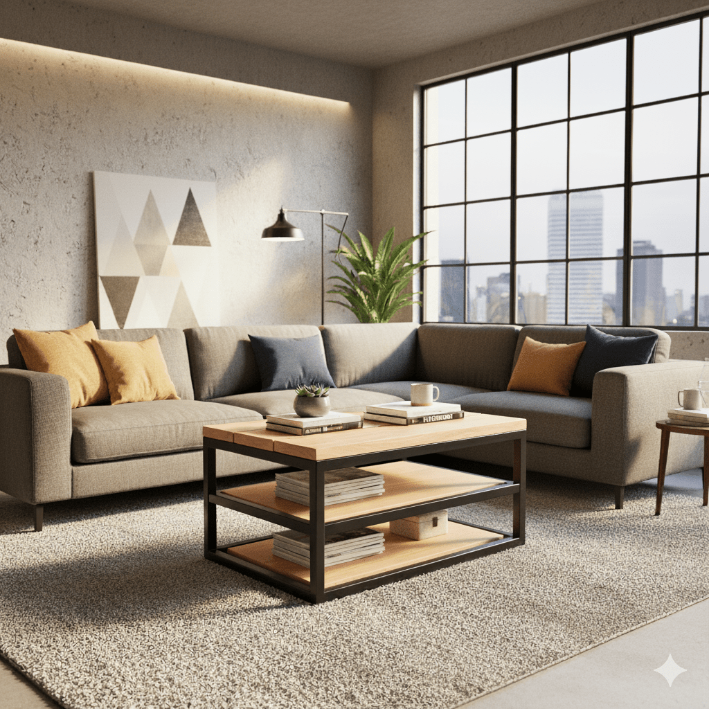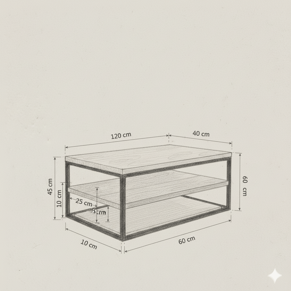 « Je souhaite une Table basse en bois et métal, style industriel moderne, avec trois niveaux avec les dimensions suivantes : longueur 100 cm profondeur 60 cm hauteur 45 cm »