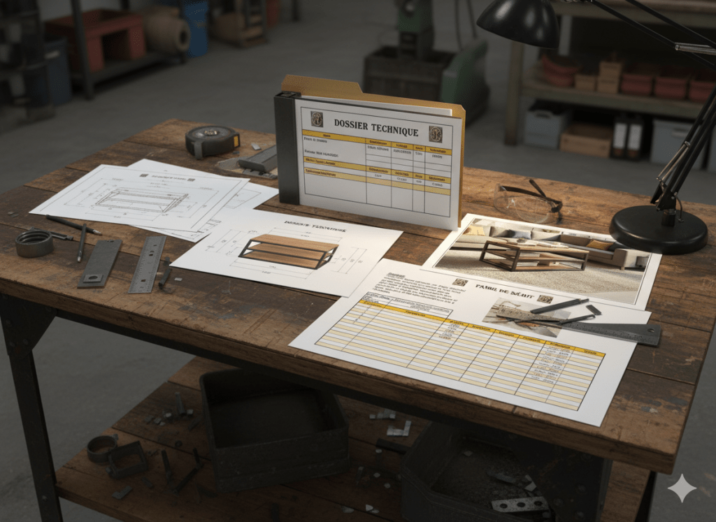 Etude de faisabilité, Plans, Nomenclature, Gamme de fabrication, Fiche de débit, DXF (programme de découpe ou de gravure laser), notice de montage , Etc.